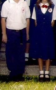 Falda (largo-debajo de la rodilla) y chaleco de tela azul con el emblema del Colegio.